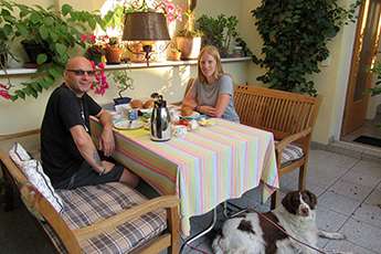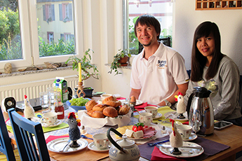 Я всегда разделяю трапезу со своими учениками в языковых курсов. Однако у меня бывали завтраки в компании с некоторыми гостями-отпускниками, для некоторых я даже готовила ужин и ела вместе с ними в занятной компании. Одна парочка из Америки взяла меня с собой на винный фестиваль во Фрайбург, вместе со своими учениками я путешествовала в Эльзас, была в музее автомобиля в Мюльхаусе, а также на одной экскурсии с дегустацией вина и на вечере красного вина с четырьмя переменами блюд в винном погребе Оберротвайля.- С гостями из Бельгии я обсуждала рецепты блюд, с голландцами смотрела по телевизору финал чемпионата мира по футболу. Некоторые гости философствовали со мной о боге и мире, другие делились чем-то полезным об уходе за цветами. С некоторыми гостями я проводила пробные занятия немецким языком, а другим рассказывала об особенностях Кайзерштуля или давала советы насчёт вылета.