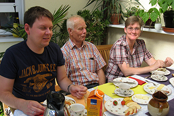 Frühstück auf dem Balkon mit Cyrille (rechts) und einer Familie auf Wochenendurlaub