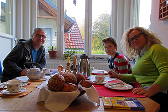 Такие космополитические семьи я здесь часто вижу: например, одна немецко-бразильская супружеская пара, или одна семья, которая была здесь в прошлом году — она была испанкой, а он — австрийцем, много лет прожили в США и уже год — в Германии. Их дети говорили на всех трех языках, можно только позавидовать! Или одна пара из Нанси: она француженка, муж — американец норвежского происхождения. Конечно, были и немецкие гости, любители походов и «велосипедных» отпусков с семьями и детьми. Если напротив, в винодельне «Барон фон Гляйхенштайн» (Weingut "Freiherr von Gleichenstein") случается свадьба, что здесь бывает в среднем два раза в год — все комнаты Пансиона заняты свадебными гостями. Потому что им, утомленным ночными, или лучше сказать, утренними танцами, нужно сделать всего пару шагов, чтобы упасть в кровать.